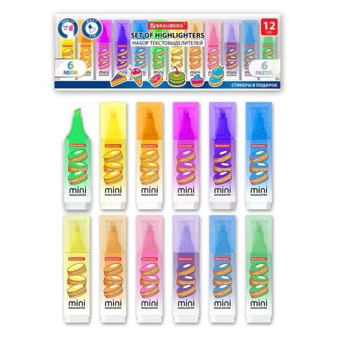 Набор текстовыделителей мини с принтами BRAUBERG предназначен для выделения текста на бумаге любого типа. Идеально подходит для решения учебных и домашних задач.12 цветов в наборе:• 6 пастельных – мятный, песочный, лавандовый, персиковый, бирюзовый, пастельный розовый;• 6 неоновых – зеленый, желтый, фиолетовый, оранжевый, голубой и розовый.Неоновые цвета позволяют ярко выделить важное в тексте, а особые пастельные оттенки создают мягкие переходы и равномерно подчеркивают необходимую информацию. В набор также входят 6 стикеров в подарок для оформления конспектов и записей. Текстовыделители имеют прямоугольную форму корпуса диаметром 20 мм. Мягкий скошенный наконечник имеет толщину линии письма от 1 до 5 мм, что обеспечивает удобство при работе с текстом, напечатанным мелким шрифтом, или таблицами.Благодаря особой водной основе чернил текстовыделители не высыхают без колпачка в течение 8 часов. Текстовыделители обладают экономным расходом чернил, при этом длина линии письма достигает 300 метров. Чернила быстро впитываются и тем самым предотвращают размазывание в процессе использования. Цвет колпачка и корпуса соответствует цвету чернил. Необычный колпак с блестками отлично дополняется яркими принтами.Текстовыделители мини – ваш ключ к эффективной работе с текстом! Выделяйте важное, структурируйте информацию, читайте с комфортом – в этом вам поможет набор текстовыделителей мини BRAUBERG!