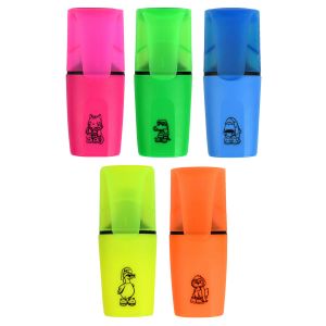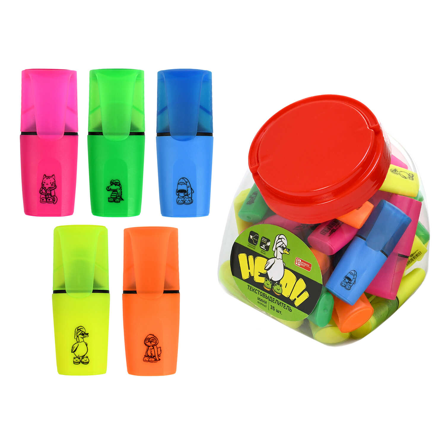 Текстовыделитель арт. 69647 / 35 ЗВЕРУШКИ В ТАПОЧКАХ (БАНКА, 35 шт., ассорти, цвет: голубой, жёлтый, зелёный, оранжевый, розовый, 72х27х17 мм, материал корпуса: полипропилен, форма наконечника: скошенная, материал наконечника: фибра (полиэтилен), УФ-печать).