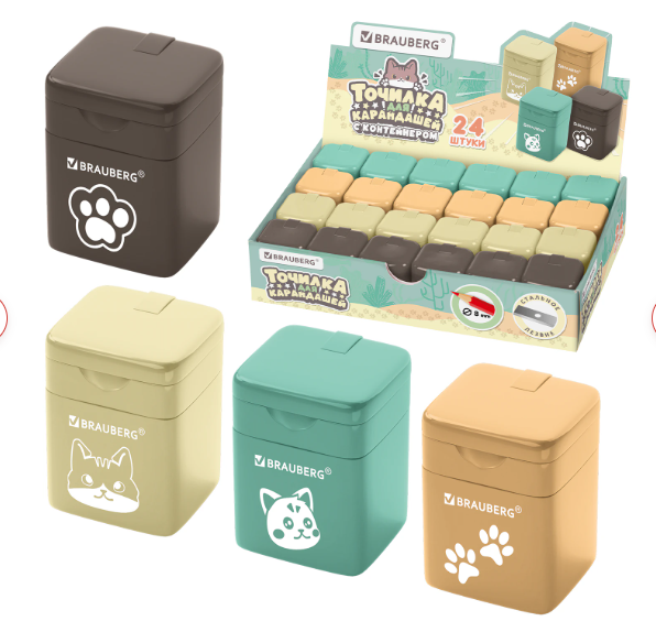 Описание: Точилка BRAUBERG "МИЛЫЕ КОТЫ" – незаменимый помощник для юных художников!Точилка прямоугольной формы с контейнером для сбора стружки. Корпус выполнен из пластика. Острое стальное лезвие продуманной конструкции обеспечивает быстрое и безопасное затачивание без повреждения грифеля. Точилка предназначена для цветных и чернографитных карандашей стандартного диаметра. Отверстие для карандаша закрывается крышкой.Выполнена в четырех цветах ассорти (без возможности выбора цвета). Компактная и эргономичная, эта точилка с легкостью поместится в любой пенал и не потеряется на рабочем столе, а оригинальный дизайн поможет в игровой форме освоить навык затачивания карандашей. Размер – 34х26х24 мм.