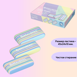 Ластик BRAUBERG "PASTEL STRIPES" предназначен для удаления надписей, сделанных чернографитными карандашами.Мягкий ластик прямоугольной формы со скругленными краями удобно лежит в руке. Универсальный дизайн и высокое качество делают его незаменимым помощником школьника и студента, художника, сотрудника офиса. Представлен в трёх вариантах полосатого принта. Размер ластика – 45х24х10 мм.