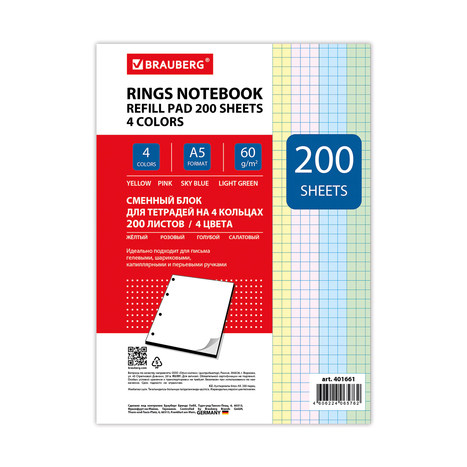 Сменный блок для тетради на кольцах А5 200л. BRAUBERG, 4 цвета по 50 листов, 401661