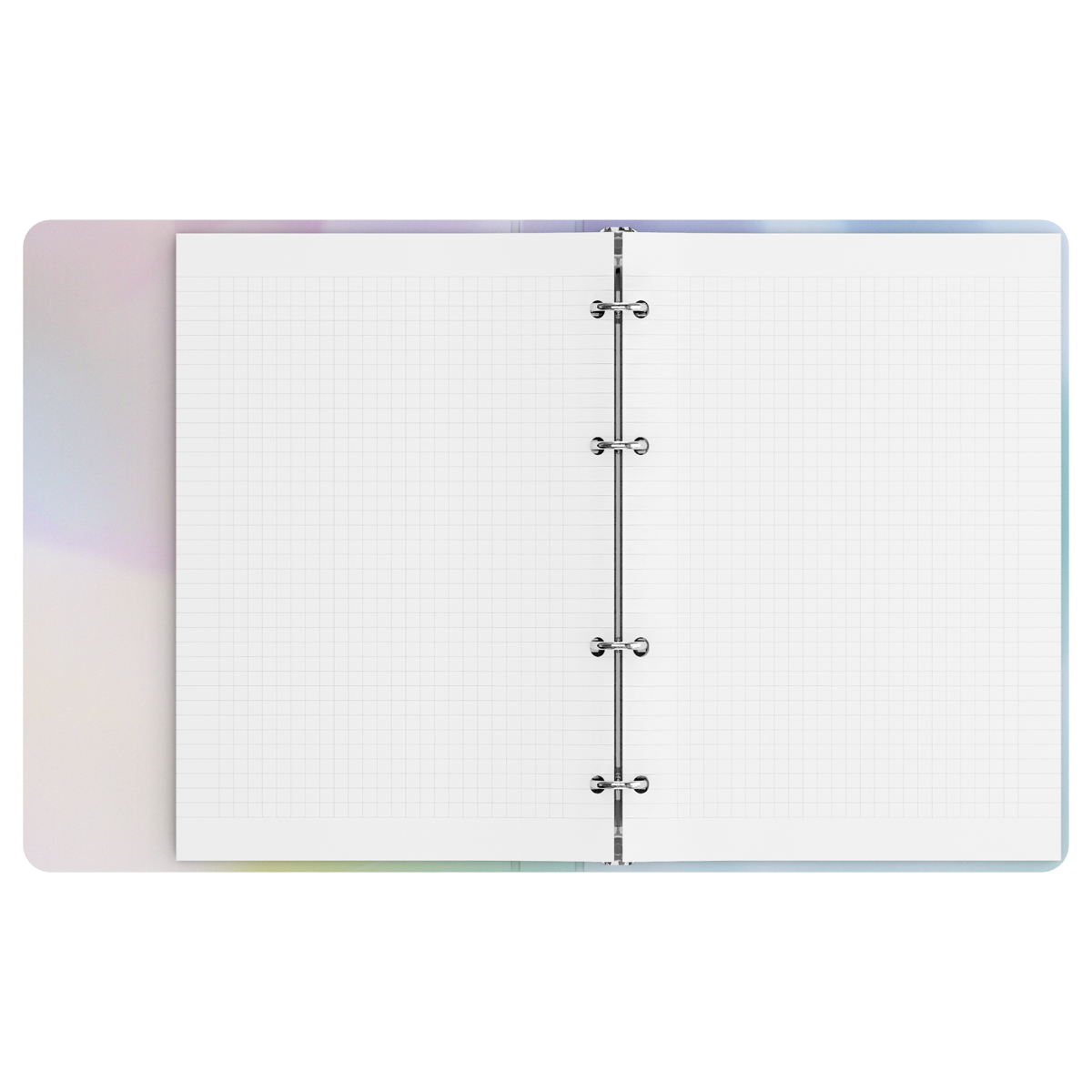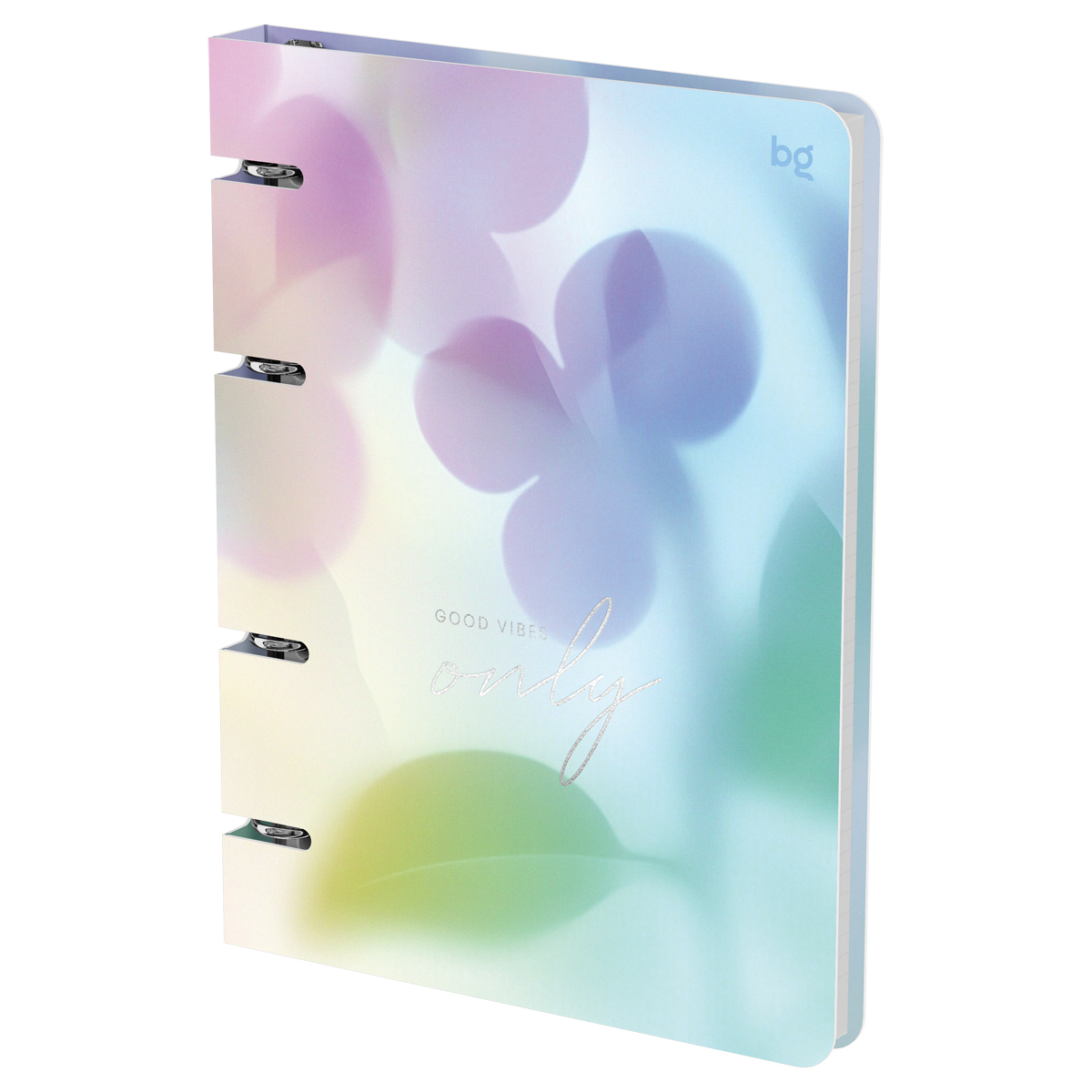 Тетрадь на кольцах BG формата А5 подходит для большого объёма записей. Эффектный дизайн обложки и форзаца поднимет настроение на учёбе или работе. Размер — 160*212 мм. Внутренний блок состоит из 120 белых листов с линовкой в клетку. Плотность офсетной бумаги — 60-65 г/м2. Белизна — 100%. Механизм из 4 колец обеспечивает быструю смену или добавление листов при необходимости. Обложка сделана из плотного картона, который надёжно защищает внутренний блок. Отделка обложки — soft-touch ламинация и тиснение фольгой. Тетрадь упакована в картон и индивидуальный пакет.