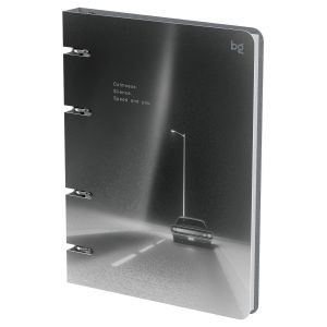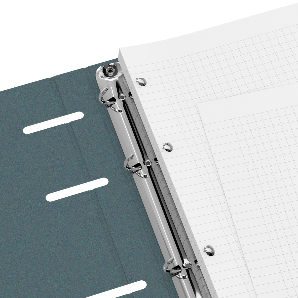 Механизм из 4 колец обеспечивает быструю смену или добавление листов при необходимости. Обложка сделана из плотного картона, который надёжно защищает внутренний блок. Отделка обложки — soft-touch ламинация. Тетрадь упакована в картон и индивидуальный пакет.