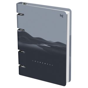 Механизм из 4 колец обеспечивает быструю смену или добавление листов при необходимости. Обложка сделана из плотного картона, который надёжно защищает внутренний блок. Отделка обложки — soft-touch ламинация. Тетрадь упакована в картон и индивидуальный пакет.