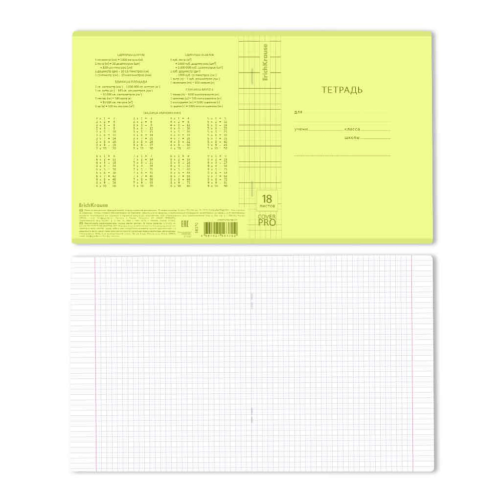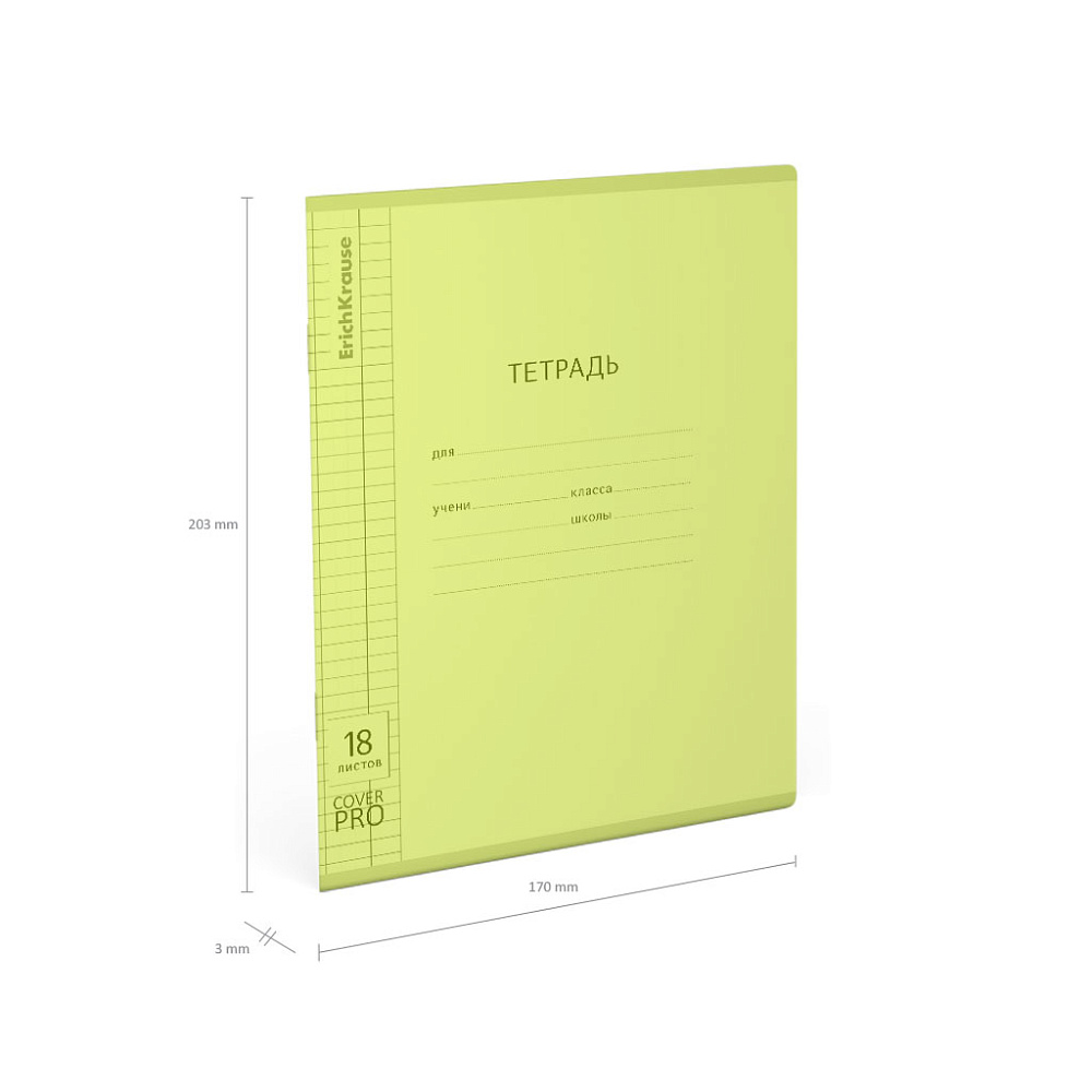 Тетрадь школьная ученическая формата А5+ (170x203 мм). Двойная обложка: внешняя выполнена из высококачественного износостойкого цветного пластика с фактурой «апельсиновая корка», внутренняя — из офсетной бумаги. В блоке 18 листов в клетку. Бумага офсетная плотностью 60 г/м2. Цвет линовки — синий. Скругленные уголки обложки и блока. Тип скрепления — скоба.