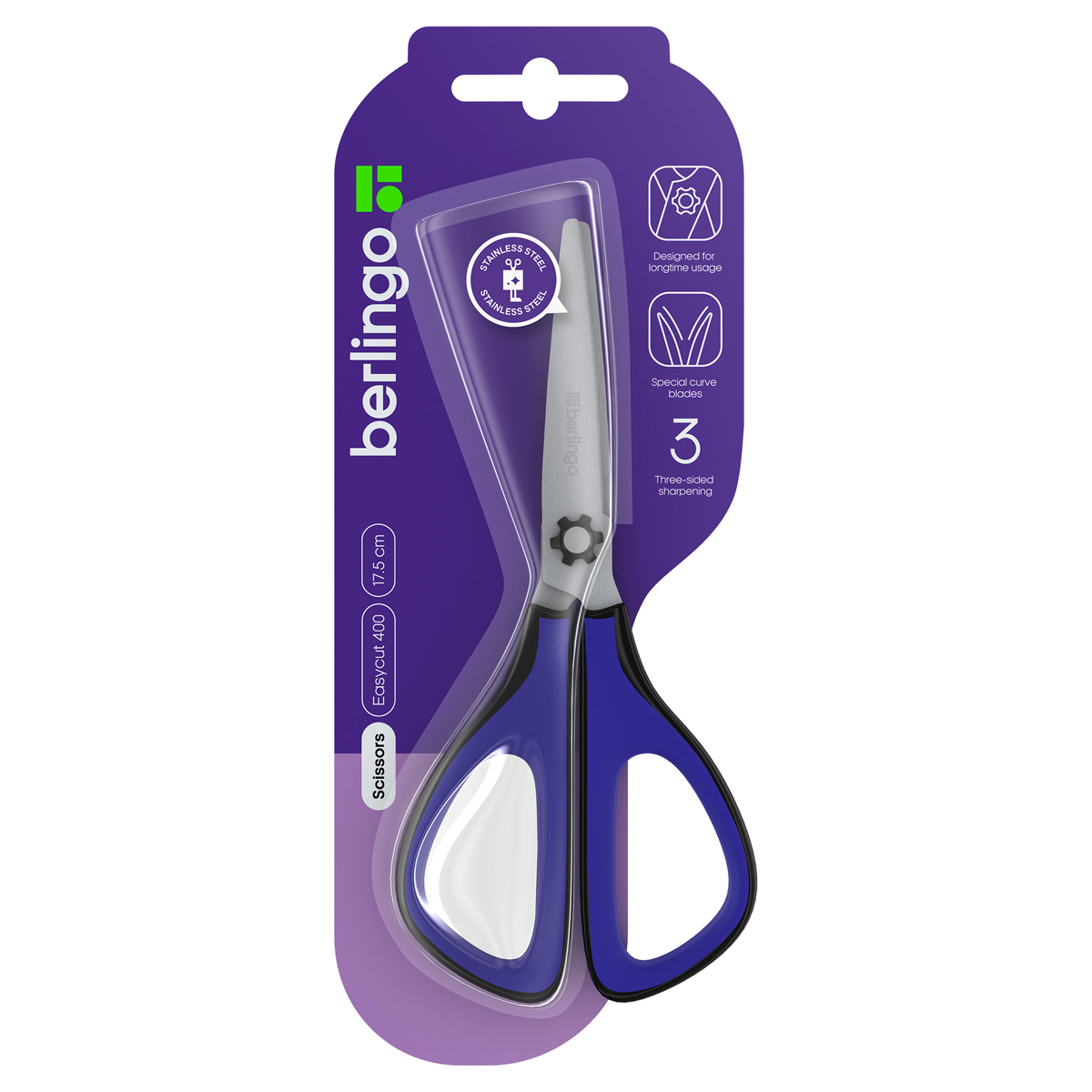Ножницы Berlingo серии EASYCUT 400 подходят для работы с бумагой и картоном. Лезвия изготовлены из качественной нержавеющей стали. Длина: 175 мм. Особая заточка лезвий делает их в три раза острее аналогов. Удобные пластиковые ручки синего цвета эргономичной формы выполнены с технологией двойного литья, что делает их более прочными и надежными. Дизайн ручек дополнен выемкой под палец и точечным дизайном для более комфортного использования. Комфорт в использовании добавляет новый усовершенствованный соединительный винт.