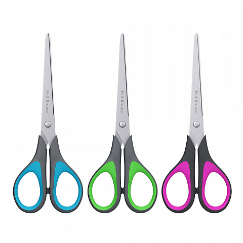 Ножницы ErichKrause 19см, ассорти. Ножницы с лезвиями из высококачественной нержавеющей стали с улучшенной двойной заточкой, повышающую легкость резки при максимальном количестве листов. Ручки классической формы с противоскользящими резиновыми вставками изготовлены из ударопрочного пластика.