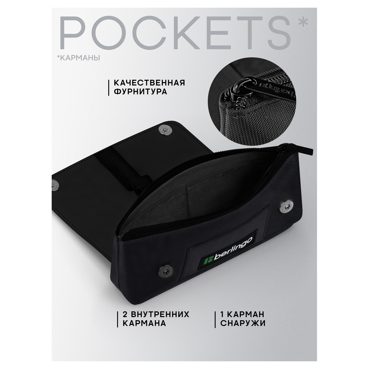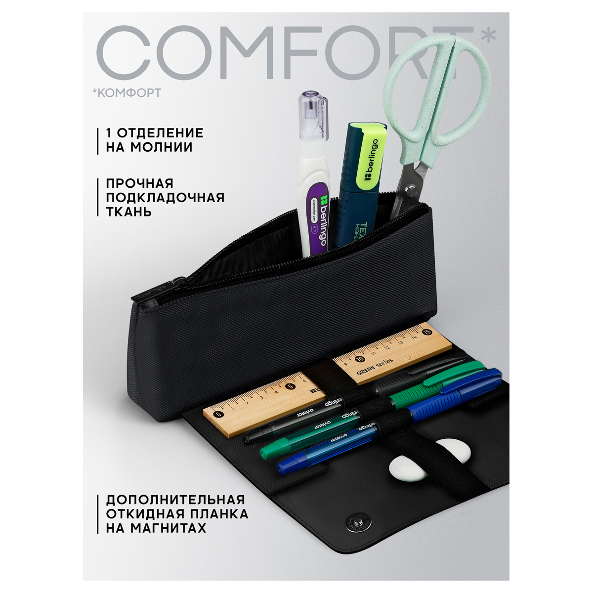 Пенал мягкий 1 отделение, 215*90*45 мм, Berlingo "Black focus", внутренний органайзер, магнит, полиэ