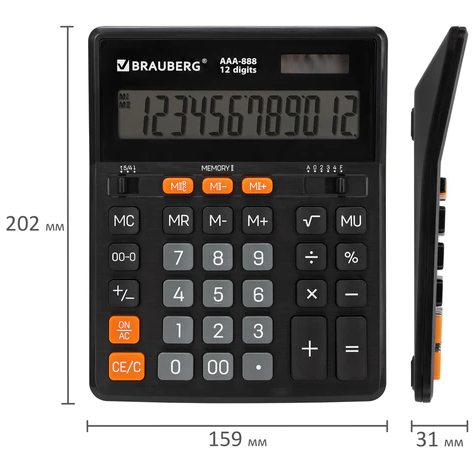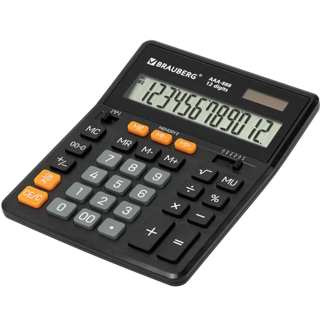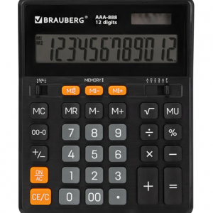 Настольный калькулятор BRAUBERG AAA-888. Большой дисплей с увеличенными символами, надежный корпус и оптимальный набор наиболее используемых функций для эффективной работы.Калькулятор поддерживает ключевые арифметические действия: возведение в степень, вычисления с процентами, извлечение квадратного корня, запоминание промежуточных результатов. Подходит для бухгалтеров благодаря наличию клавиш двойной памяти, "00" и MU для расчетов налогов и торговой наценки. С переключателями округления и положения десятичного знака.Большой двенадцатиразрядный дисплей с акриловым экраном комфортно отображает большие символы с высокой точностью округления. Встроенный аккумулятор и солнечная батарея позволяют калькулятору работать при любом освещении, а клавиша выключения OFF и функция автоматического отключения (через 8-10 минут бездействия) позволяют максимально продлить срок его службы без замены батареи.Размер – 202x159 мм.